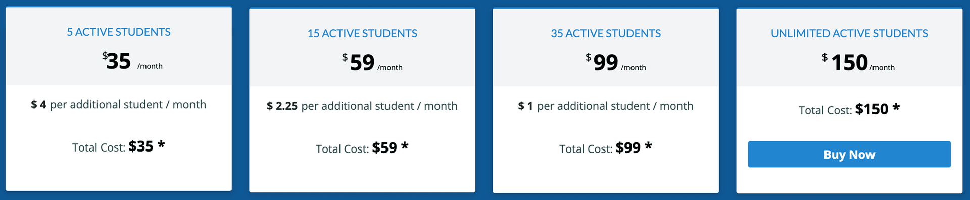 If you intend to maintain less than 10 active students in total, then intro price looks great. You also have the option of toggling your client between "active" and "prospective" to manage your account. This requires turning off an "active" client first and then enabling your "prospect" to allow for editing their account. That sounds cumbersome to me and not the vision I have for my tools. But if you don't mind - then it could work for you!